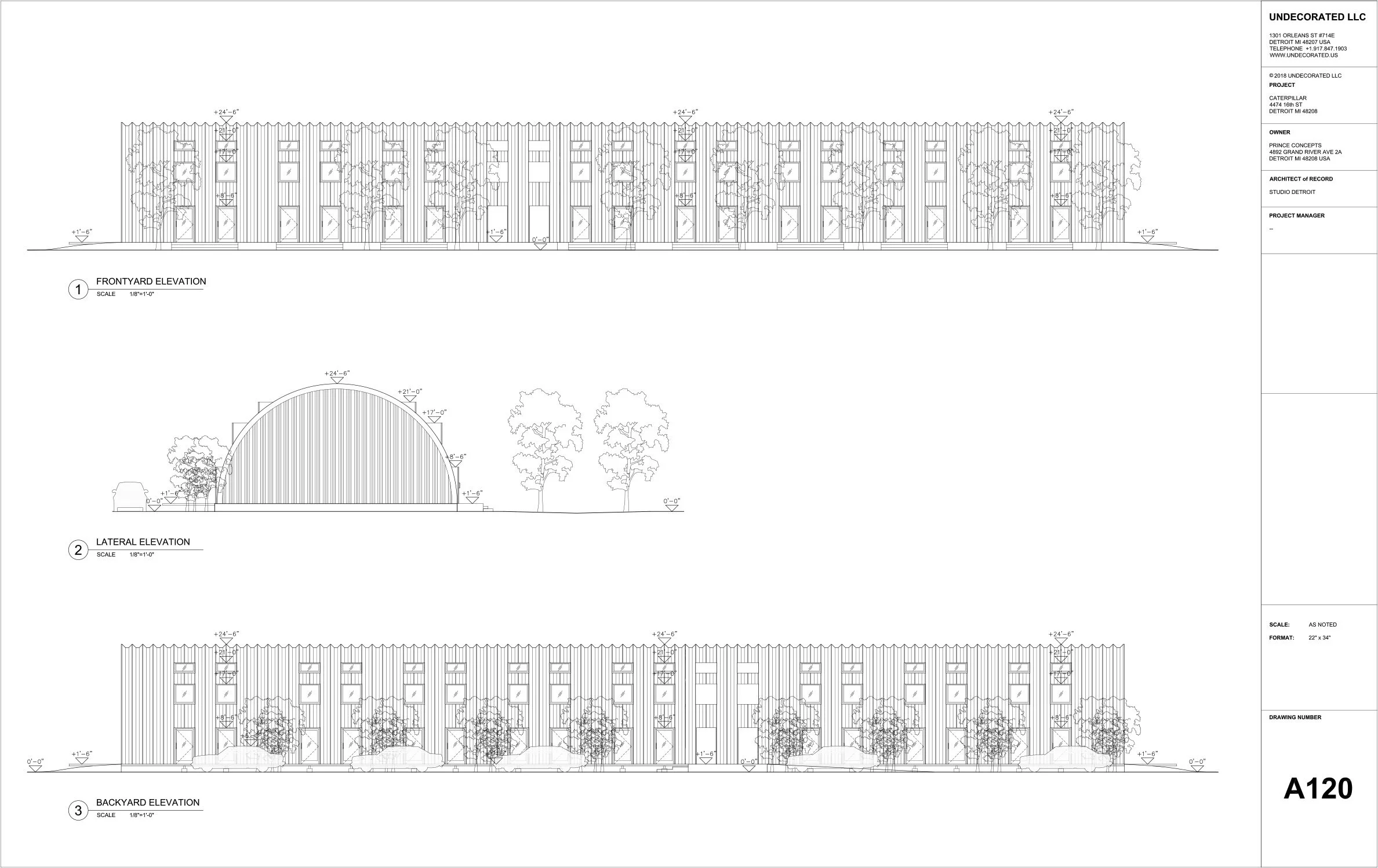 Taking inspiration from a UFO crash landing in the forest, we’re using the Quonset hut as a 9,000 sf sculpture with 6 residences and 2 Live/Work spaces. Anchored by a future public park, people can soak up the majesty of a new age monument. The units will have 23’ tall ceilings, ethereal natural light, calming curves, and a ‘Jetsons’ style genesis chamber that residents will use to transform from “just barely awake” to “ready for action.” Instead of front yards, the hut will be lifted and feature a stoop that looks out onto a heavily planted park/garden. The Caterpillar will anchor an interesting block that is home to an iconic Detroit Church building (across the street), and the active and vibrant Fisheye Farm (next door). This mostly vacant block, with these two unique uses, allowed for Caterpillar to not match the standard scale and program of the traditional Detroit residential streets, designed for single family units. The Caterpillar is 192’ long x 46’ wide x 23’tall